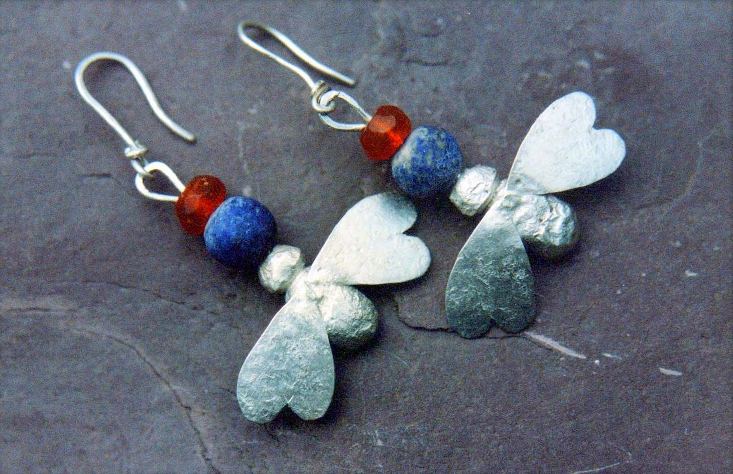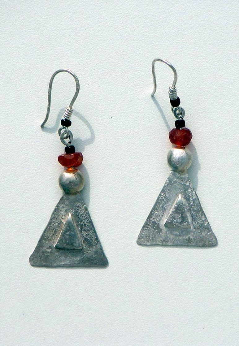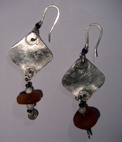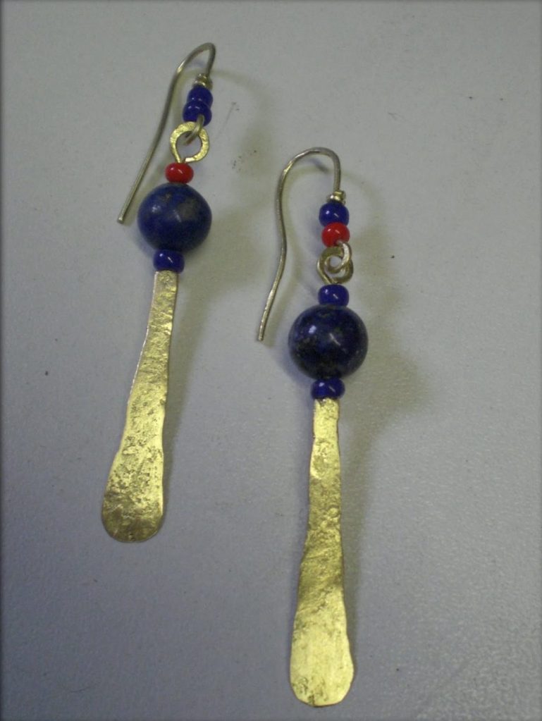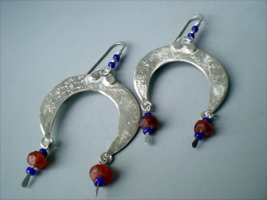 I use a lot of lapis, amber, carnelian, and amethyst in the earrings, along with small trade beads and handmade silver spacers. The stones are either set in bezels or strung as part of the composition. The metalwork is always textured – sometimes subtly, sometimes heavily oxidized and worked to look almost ancient.