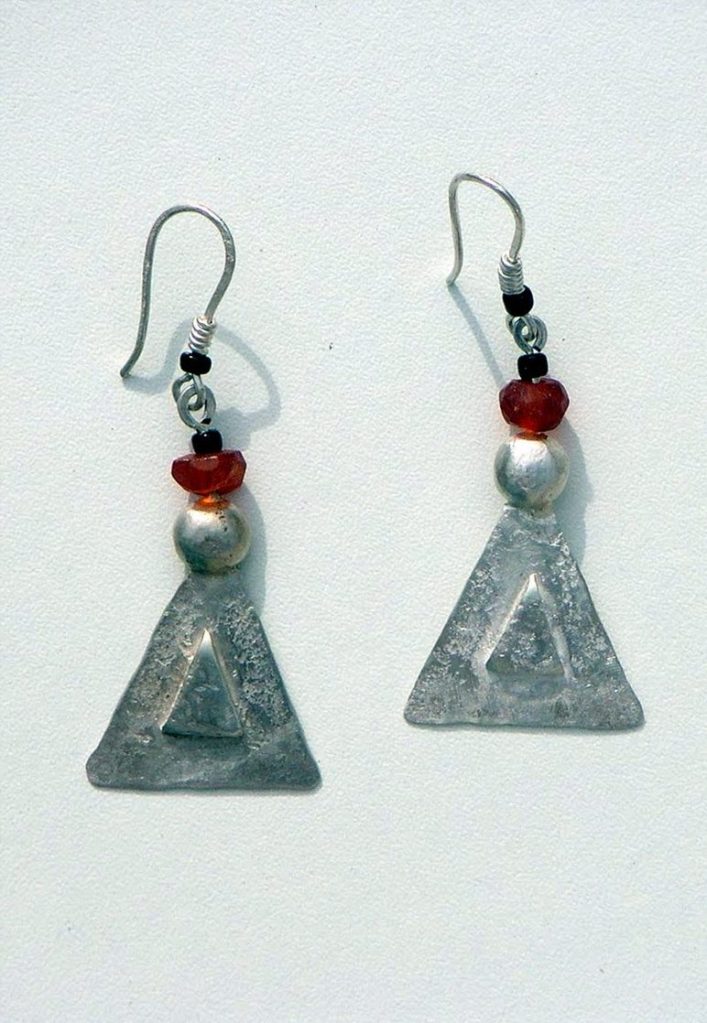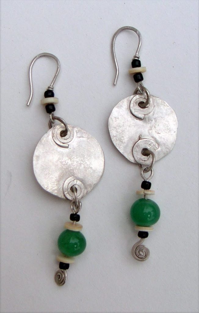 The drop earrings are where I allow myself more freedom. Some are minimal – a single hammered disc or triangle hanging from a wire, maybe with a small gold detail. Others are more elaborate: long tapering forms in textured silver, or large geometric shapes combined with beads and stones. I’m drawn to crescent and lunate shapes, heavily textured discs, and architectural forms that move when you move.