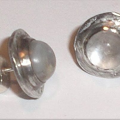 The studs tend to be straightforward: small textured settings holding moonstone, lapis, or other cabochons, sometimes with a gold centre or accent. I also make simple geometric forms – spirals, circles, domes – that sit close to the ear. These are quiet pieces, designed to be worn without thinking about them.